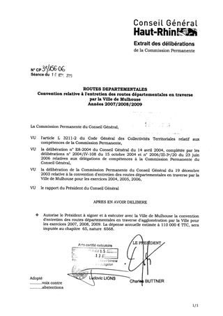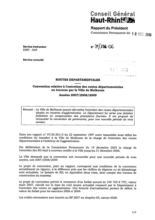 La Ville de Mulhouse assure elle-même l'entretien des routes départementales situées en traverse d'agglomération. Le Département lui verse une dotation forfaitaire en compensation des prestations fournies. Il est proposé de renouveler la convention de partenariat, pour une nouvelle période de trois années.