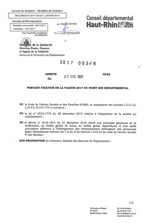 portant fixation de la valeur 2017 du point GIR départemental Resumé Pièces jointes ARRETE Assemblée : Non défini Date : 02/11/2017 Rapporteur : Non défini Collectivité : Conseil départemental du Haut-Rhin Direction : Non défini Service : Direction de la Solidarité Domaine : Dotations financières Commission :