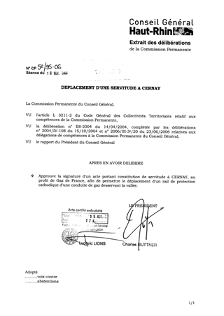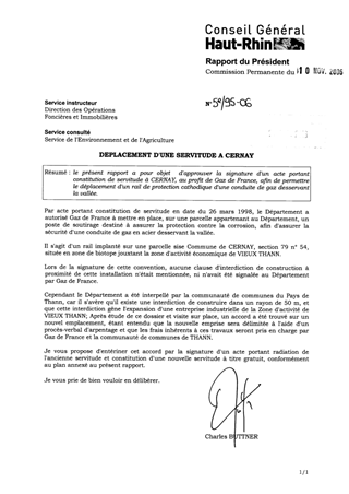 le présent rapport a pour objet d'approuver la signature d'un acte portant constitution de servitude à CERNAY, au profit de Gaz de France, afin de permettre le déplacement d'un rail de protection cathodique d'une conduite de gaz desservant la vallée.