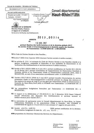 portant fixation des tarifs horaires et de la dotation globale 2017 du service d'aide et d'accompagnement à domicile auprès des familles de l'association "A Dom'Aide 68" à MULHOUSE Resumé Pièces jointes ARRETE Assemblée : Non défini Date : 16/11/2017 Rapporteur : Non défini Collectivité : Conseil départemental du Haut-Rhin Direction : Non défini Service : Direction de la Solidarité Domaine : Dotations financières Commission :