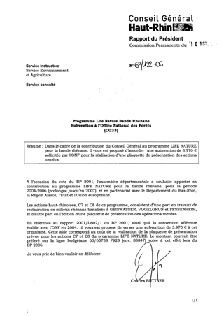 Dans le cadre de la contribution du Conseil Général au programme LIFE NATURE pour la bande rhénane, il vous est proposé d’accorder une subvention de 3.970 € sollicitée par l’ONF pour la réalisation d’une plaquette de présentation des actions menées.