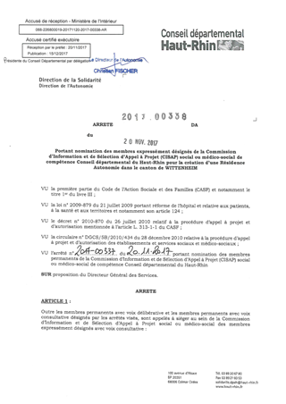 portant nomination des membres expressément désignés de la Commission d'Information et de Sélection d'Appel à Projet (CISAP) social ou médico-social de compétence Conseil départemental du Haut-Rhin pour la création d'une résidence autonomie dans le canton