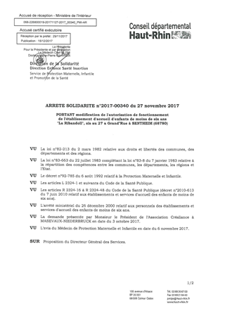 portant modification de l'autorisation de fonctionnement de l'établissement d'accueil d'enfants de moins de six ans "La Ribandoll", sis au 27 a Grand'Rue à SENTHEIM (68780) Resumé Pièces jointes ARRETE Assemblée : Non défini Date : 27/11/2017 Rapporteur : Non défini Collectivité : Conseil départemental du Haut-Rhin Direction : Non défini Service : Direction de la Solidarité Domaine : Accueil d'enfants Commission :