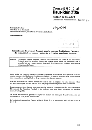 Le présent rapport propose l’octroi d’une subvention de 2 000 € au Mouvement Français pour le planning familial en faveur d’une action de prévention sur la sexualité et ses risques faisant intervenir le théâtre « Arc en ciel » dans quatre collèges de Mulhouse.