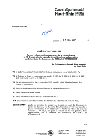 portant réglementation permanente de la circulation sur la RD 2 (route classée à grande circulation), hors agglomération, sur le territoire des communes de CERNAY et WITTELSHEIM Resumé Pièces jointes ARRETE Assemblée : Non défini Date : 05/12/2017 Rapporteur : Non défini Collectivité : Conseil départemental du Haut-Rhin Direction : Non défini Service : Direction des Routes Domaine : Circulation Commission :