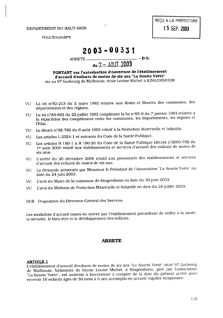 portant sur l'autorisation d'ouverture de l'établissement d'accueil d'enfants de moins de six ans "La Souris Verte" sis au 97 faubourg de Mulhouse, école Louise Michel à KINGERSHEIM. Resumé Pièces jointes ARRETE Assemblée : Non défini Date : 07/08/2003 Rapporteur : Non défini Collectivité : Conseil départemental du Haut-Rhin Direction : Non défini Service : Direction de la Solidarité Domaine : Accueil d'enfants Commission :
