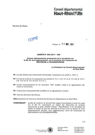 portant réglementation permanente de la circulation sur la RD 45, hors agglomération, sur le territoire des communes de BISCHWIHR et WICKERSCHWIHR Resumé Pièces jointes ARRETE Assemblée : Non défini Date : 11/12/2017 Rapporteur : Non défini Collectivité : Conseil départemental du Haut-Rhin Direction : Non défini Service : Direction des Routes Domaine : Circulation Commission :