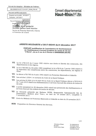 portant modification de l'autorisation de fonctionnement de l'établissement d'accueil d'enfants de moins de six ans "Coquelibulle" sis au 2 rue des Coquelicots à NIEDERENTZEN (68127) Resumé Pièces jointes ARRETE Assemblée : Non défini Date : 14/12/2017 Rapporteur : Non défini Collectivité : Conseil départemental du Haut-Rhin Direction : Non défini Service : Direction de la Solidarité Domaine : Accueil d'enfants Commission :