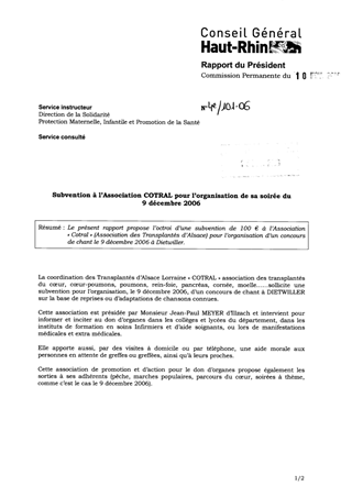Le présent rapport propose l’octroi d’une subvention de 100 € à l’Association « Cotral » (Association des Transplantés d’Alsace) pour l’organisation d’un concours de chant le 9 décembre 2006 à Dietwiller.