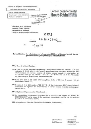 portant fixation des prix de journée hébergement 2018 de la Maison d'accueil rurale pour personnes âgées (MARPA) de BRECHAUMONT Resumé Pièces jointes ARRETE Assemblée : Non défini Date : 03/01/2018 Rapporteur : Non défini Collectivité : Conseil départemental du Haut-Rhin Direction : Non défini Service : Direction de la Solidarité Domaine : Personnes Agées Commission :