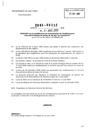 portant sur la modification de l'autorisation de l'établissement d'accueil d'enfants de moins de six ans "La Trottinette" sis au 13 rue des Alliés à GUEBWILLER. Resumé Pièces jointes ARRETE Assemblée : Non défini Date : 07/08/2003 Rapporteur : Non défini Collectivité : Conseil départemental du Haut-Rhin Direction : Non défini Service : Direction de la Solidarité Domaine : Accueil d'enfants Commission :