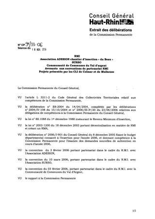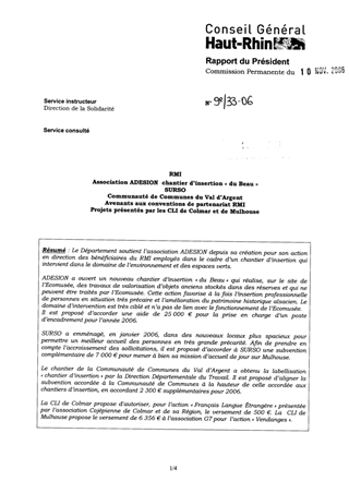 Le Département soutient l’association ADESION depuis sa création pour son action en direction des bénéficiaires du RMI employés dans le cadre d’un chantier d’insertion qui intervient dans le domaine de l’environnement et des espaces verts. ADESION a ouvert un nouveau chantier d’insertion « du Beau » qui réalise, sur le site de l’Ecomusée, des travaux de valorisation d’objets anciens stockés dans des réserves et qui ne peuvent être traités par l’Ecomusée. Cette action favorise à la fois l’insertion professionnelle de personnes en situation très précaire et l’amélioration du patrimoine historique alsacien. Le domaine d’intervention est très ciblé et n’a pas de lien avec le fonctionnement de l’Ecomusée. Il est proposé d’accorder une aide de 25 000 € pour la prise en charge d’un poste d’encadrement pour l’année 2006. SURSO a emménagé, en janvier 2006, dans des nouveaux locaux plus spacieux pour permettre un meilleur accueil des personnes en très grande précarité. Afin de prendre en compte l’accroissement des sollicitations, il est proposé d’accorder à SURSO une subvention complémentaire de 7 000 € pour mener à bien sa mission d’accueil de jour sur Mulhouse. Le chantier de la Communauté de Communes du Val d’Argent a obtenu la labellisation « chantier d’insertion » par la Direction Départementale du Travail. Il est proposé d’aligner la subvention accordée à la Communauté de Communes à la hauteur de celle accordée aux chantiers d’insertion, en accordant 2 300 € supplémentaires pour 2006. La CLI de Colmar propose d'autoriser, pour l’action « Français Langue Étrangère » présentée par l’association Cojépienne de Colmar et de sa Région, le versement de 500 €. La CLI de Mulhouse propose le versement de 6 356 € à l’association G7 pour l’action « Vendanges ».