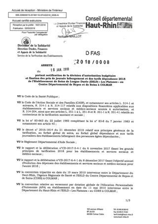 portant notification de la décision d'autorisation budgétaire et fixation du prix de journée hébergement et des tarifs dépendance 2018 de l'établissement de soins de longue durée (ESLD) "Les Platanes" au centre départemental de repos et de soins à COLMAR