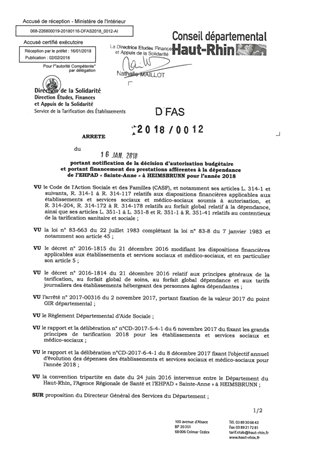 portant notification de la décision d'autorisation budgétaire et portant financement des prestations afférentes à la dépendance de l'EHPAD "Sainte-Anne" à HEIMSBRUNN pour l'année 2018 Resumé Pièces jointes ARRETE Assemblée : Non défini Date : 16/01/2018 Rapporteur : Non défini Collectivité : Conseil départemental du Haut-Rhin Direction : Non défini Service : Direction de la Solidarité Domaine : Dotations financières Commission :
