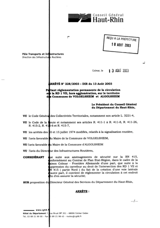 portant réglementation permanente de la circulation sur la RD 1 VII, hors agglomération, sur le territoire des communes de VOGELSHEIM et ALGOLSHEIM. Resumé Pièces jointes ARRETE Assemblée : Non défini Date : 13/08/2003 Rapporteur : Non défini Collectivité : Conseil départemental du Haut-Rhin Direction : Non défini Service : Direction des Routes Domaine : Circulation Commission :