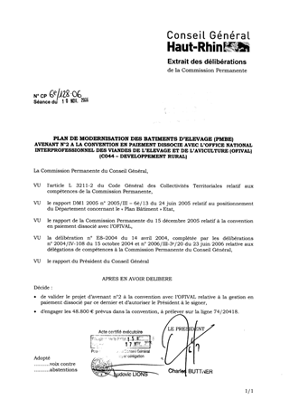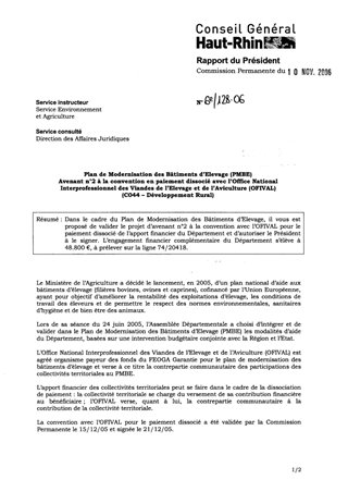Dans le cadre du Plan de Modernisation des Bâtiments d’Elevage, il vous est proposé de valider le projet d’avenant n°2 à la convention avec l’OFIVAL pour le paiement dissocié de l’apport financier du Département et d’autoriser le Président à le signer. L’engagement financier complémentaire du Département s’élève à 48.800 €, à prélever sur la ligne 74/20418.