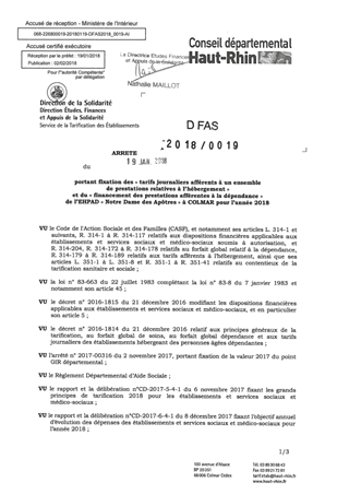 portant fixation des "tarifs journaliers afférents à un ensemble de prestations relatives à l'hébergement" et du "financement des prestations afférentes à la dépendance" de l'EHPAD "Notre Dame des Apôtres" à COLMAR pour l'année 2018 Resumé Pièces jointes ARRETE Assemblée : Non défini Date : 19/01/2018 Rapporteur : Non défini Collectivité : Conseil départemental du Haut-Rhin Direction : Non défini Service : Direction de la Solidarité Domaine : Prix de Journée Commission :