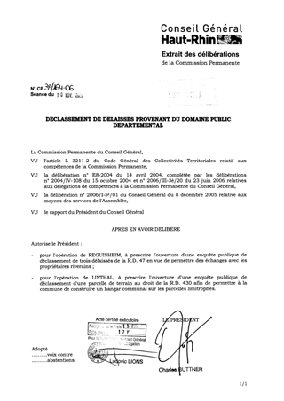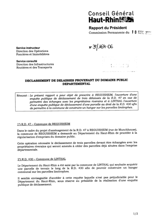Le présent rapport a pour objet de prescrire à REGUISHEIM, l'ouverture d'une enquête publique de déclassement de trois délaissés de la R.D. 47 en vue de permettre des échanges avec les propriétaires riverains et à LINTHAL l'ouverture d'une enquête publique de déclassement d'une parcelle au droit de la R.D. 430 afin de permettre à la commune de construire un hangar sur les parcelles limitrophes.