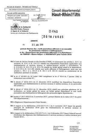 portant fixation des "tarifs journaliers afférents à un ensemble de prestations relatives à l'hébergement" et du "financement des prestations afférentes à la dépendance" de l'EHPAD "Oeuvre Schyrr" à HOCHSTATT pour l'année 2018 Resumé Pièces jointes ARRETE Assemblée : Non défini Date : 22/01/2018 Rapporteur : Non défini Collectivité : Conseil départemental du Haut-Rhin Direction : Non défini Service : Direction de la Solidarité Domaine : Prix de Journée Commission :