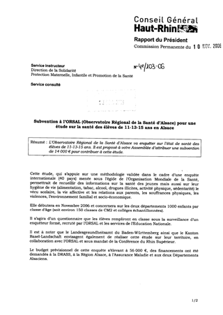 L’Observatoire Régional de la Santé d’Alsace va enquêter sur l’état de santé des élèves de 11-13-15 ans. Il est proposé à votre Assemblée d’attribuer une subvention de 14 000 € pour contribuer à cette étude.