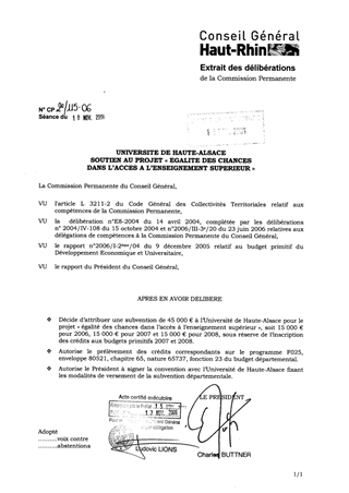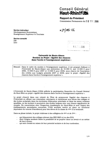 Dans le cadre du soutien à l’enseignement supérieur, il est proposé d’allouer à l’Université de Haute-Alsace une subvention de 45 000 €, soit 15 000 € pour 2006, 15 000 € pour 2007 et 15 000 € pour 2008, sous réserve de l’inscription des crédits aux budgets primitifs 2007 et 2008, pour le projet « Egalité des chances dans l’accès à l’enseignement supérieur ».