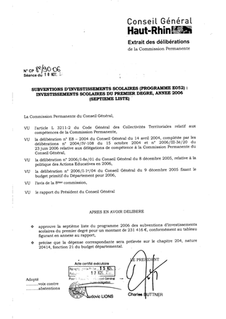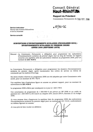 La Commission Permanente a délégation pour programmer les subventions d’investissements scolaires du premier degré, tout au long de l’année. Ce rapport concerne une septième série de subventions relatives au programme 2006, pour un montant de 231 416 €.