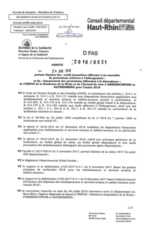 portant fixation des "tarifs journaliers afférents à un ensemble de prestations relatives à l'hébergement" et du "financement des prestations afférentes à la dépendance" de l'EHPAD de la Résidence de la Weiss et de l'accueil de jour à AMMERSCHWIHR et KAYS