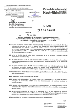 portant notification de la décision d'autorisation budgétaire et portant financement des prestations afférentes à la dépendance de l'EHPAD "Korian La Cotonnade" à PFASTATT pour l'année 2018 Resumé Pièces jointes ARRETE Assemblée : Non défini Date : 24/01/2018 Rapporteur : Non défini Collectivité : Conseil départemental du Haut-Rhin Direction : Non défini Service : Direction de la Solidarité Domaine : Dotations financières Commission :