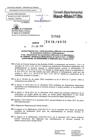 portant fixation des "tarifs journaliers afférents à un ensemble de prestations relatives à l'hébergement" et du "financement des prestations afférentes à la dépendance" de l'EHPAD "Résidences Médicalisées du Canton Vert" à ORBEY, LAPOUTROIE, LE BONHOMME