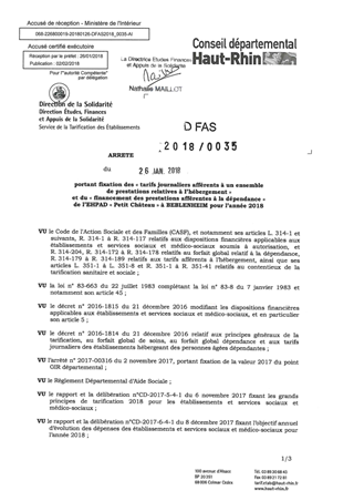 portant fixation des "tarifs journaliers afférents à un ensemble de prestations relatives à l'hébergement" et du "financement des prestations afférentes à la dépendance" de l'EHPAD "Petit Château" à BEBLENHEIM pour l'année 2018 Resumé Pièces jointes ARRETE Assemblée : Non défini Date : 26/01/2018 Rapporteur : Non défini Collectivité : Conseil départemental du Haut-Rhin Direction : Non défini Service : Direction de la Solidarité Domaine : Prix de Journée Commission :