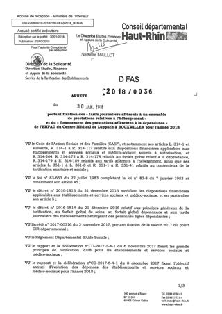 portant fixation des "tarifs journaliers afférents à un ensemble de prestatiions relatives à l'hébergement" et du "financement des prestations afférentes à la dépendance" de l'EHPAD du centre médical de Luppach à BOUXWILLER pour l'année 2018 Resumé Pièces jointes ARRETE Assemblée : Non défini Date : 30/01/2018 Rapporteur : Non défini Collectivité : Conseil départemental du Haut-Rhin Direction : Non défini Service : Direction de la Solidarité Domaine : Prix de Journée Commission :