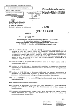 portant fixation des "tarifs journaliers afférents à un ensemble de prestatiions relatives à l'hébergement" et du "financement des prestations afférentes à la dépendance" de l'EHPAD "Béthesda" à MULHOUSE pour l'année 2018 Resumé Pièces jointes ARRETE Assemblée : Non défini Date : 30/01/2018 Rapporteur : Non défini Collectivité : Conseil départemental du Haut-Rhin Direction : Non défini Service : Direction de la Solidarité Domaine : Prix de Journée Commission :