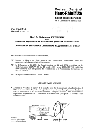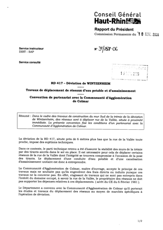 RD 417. Déviation de Wintzenheim. Travaux de déplacement de réseaux d'eau potable et d'assainissement. Convention de partenariat avec la CAC