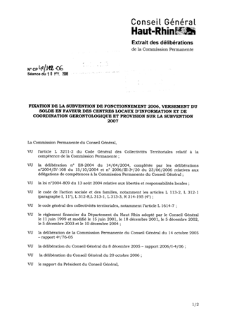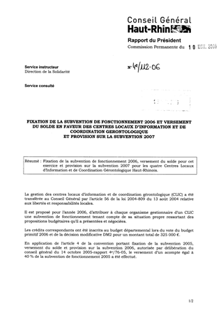 Fixation de la subvention de fonctionnement 2006, versement du solde pour cet exercice et provision sur la subvention 2007 pour les quatre Centres Locaux d’Information et de Coordination Gérontologique Haut-Rhinois.