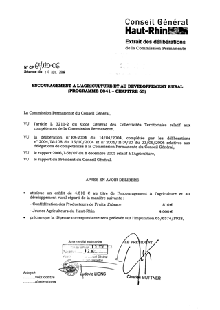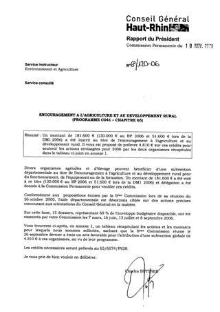 Un montant de 181.600 € (130.000 € au BP 2006 et 51.600 € lors de la DM1 2006) a été inscrit au titre de l’encouragement à l’agriculture et au développement rural. Il vous est proposé de prélever 4.810 € sur ces crédits pour soutenir les actions envisagées pour 2006 par les deux organismes récapitulés dans le tableau ci-joint en annexe 1.