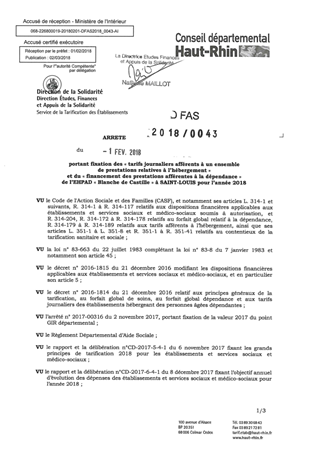 portant fixation des "tarifs journaliers afférents à un ensemble de prestations relatives à l'hébergement" et du "financement des prestations afférentes à la dépendance" de l'EHPAD "Blanche de Castille" à SAINT LOUIS pour l'année 2018 Resumé Pièces jointes ARRETE Assemblée : Non défini Date : 01/02/2018 Rapporteur : Non défini Collectivité : Conseil départemental du Haut-Rhin Direction : Non défini Service : Direction de la Solidarité Domaine : Prix de Journée Commission :