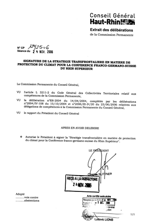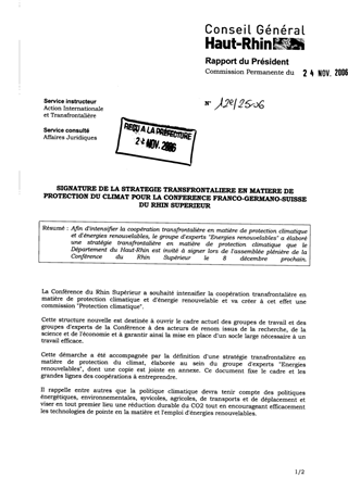 Afin d'intensifier la coopération transfrontalière en matière de protection climatique et d'énergies renouvelables, le groupe d'experts "Energies renouvelables" a élaboré une stratégie transfrontalière en matière de protection climatique que le Département du Haut-Rhin est invité à signer lors de l'assemblée plénière de la Conférence du Rhin Supérieur le 8 décembre prochain.