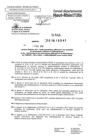 portant fixation des "tarifs journaliers afférents à un ensemble de prestations relatives à l'hébergement" et du "financement des prestations afférentes à la dépendance" de l'EHPAD "Père Faller" à BELLEMAGNY pour l'année 2018 Resumé Pièces jointes ARRETE Assemblée : Non défini Date : 01/02/2018 Rapporteur : Non défini Collectivité : Conseil départemental du Haut-Rhin Direction : Non défini Service : Direction de la Solidarité Domaine : Prix de Journée Commission :