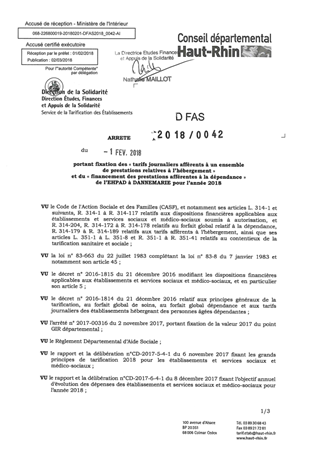 portant fixation des "tarifs journaliers afférents à un ensemble de prestations relatives à l'hébergement" et du "financement des prestations afférentes à la dépendance" de l'EHPAD à DANNEMARIE pour l'année 2018 Resumé Pièces jointes ARRETE Assemblée : Non défini Date : 01/02/2018 Rapporteur : Non défini Collectivité : Conseil départemental du Haut-Rhin Direction : Non défini Service : Direction de la Solidarité Domaine : Prix de Journée Commission :