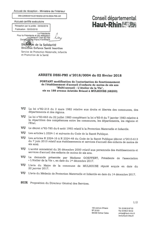 portant modification de l'autorisation de fonctionnement de l'établissement d'enfants de moins de six ans "Multi-accueil - L'Atelier de la Vie", sis au 188 avenue Aristide Briand à MULHOUSE (68200) Resumé Pièces jointes ARRETE Assemblée : Non défini Date : 02/02/2018 Rapporteur : Non défini Collectivité : Conseil départemental du Haut-Rhin Direction : Non défini Service : Direction de la Solidarité Domaine : Accueil d'enfants Commission :