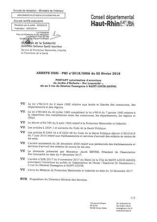 portant autorisation d'ouverture du Jardin d'Enfants "Ner Lemosché", sis au 3 rue du Général Cassagnou à SAINT-LOUIS (68300) Resumé Pièces jointes ARRETE Assemblée : Non défini Date : 02/02/2018 Rapporteur : Non défini Collectivité : Conseil départemental du Haut-Rhin Direction : Non défini Service : Direction de la Solidarité Domaine : Accueil d'enfants Commission :