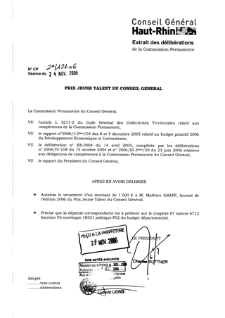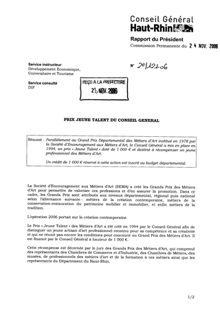 Parallèlement au Grand Prix Départemental des Métiers d’Art institué en 1978 par la Société d’Encouragement aux Métiers d’Art, le Conseil Général a mis en place en 1994, un prix « Jeune Talent » doté de 1 000 € et destiné à récompenser un jeune professionnel des Métiers d’Art. Un crédit de 1 000 € réservé à cette action est inscrit au budget départemental.