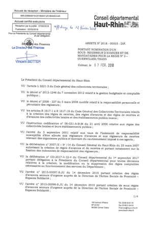 portant nomination d'un sous-régisseur d'avances et de mandataires pour la régie n° 3 - GUEBWILLER / THANN Resumé Pièces jointes ARRETE Assemblée : Non défini Date : 07/02/2018 Rapporteur : Non défini Collectivité : Conseil départemental du Haut-Rhin Direction : Non défini Service : DGA Ressources Domaine : Autres (non classés) Commission :
