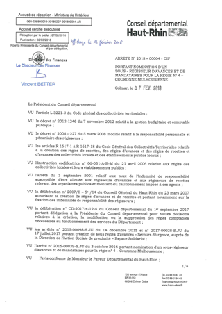 portant nomination d'un sous-régisseur d'avances et de mandataires pour la régie n° 4 - Couronne Mulhousienne Resumé Pièces jointes ARRETE Assemblée : Non défini Date : 07/02/2018 Rapporteur : Non défini Collectivité : Conseil départemental du Haut-Rhin Direction : Non défini Service : DGA Ressources Domaine : Autres (non classés) Commission :