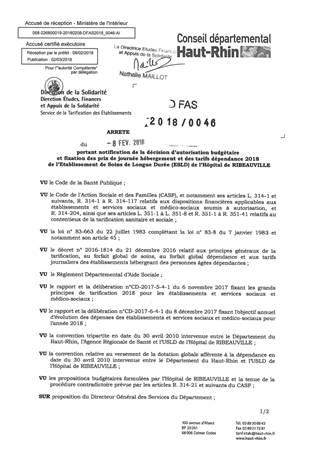portant notification de la décision d'autorisation budgétaire et fixation des prix de journée hébergement et des tarifs dépendance 2018 de l'établissement de soins de longue durée (ESLD) de l'hôpital de RIBEAUVILLE Resumé Pièces jointes ARRETE Assemblée : Non défini Date : 08/02/2018 Rapporteur : Non défini Collectivité : Conseil départemental du Haut-Rhin Direction : Non défini Service : Direction de la Solidarité Domaine : Prix de Journée Commission :