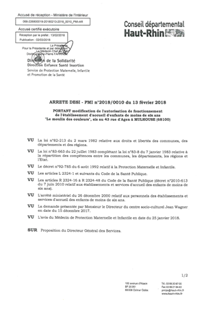 portant modification de l'autorisation de fonctionnement de l'établissement d'accueil d'enfants de moins de six ans "Le Moulin des couleurs", sis au 43 rue d'Agen à MULHOUSE (68100) Resumé Pièces jointes ARRETE Assemblée : Non défini Date : 13/02/2018 Rapporteur : Non défini Collectivité : Conseil départemental du Haut-Rhin Direction : Non défini Service : Direction de la Solidarité Domaine : Accueil d'enfants Commission :