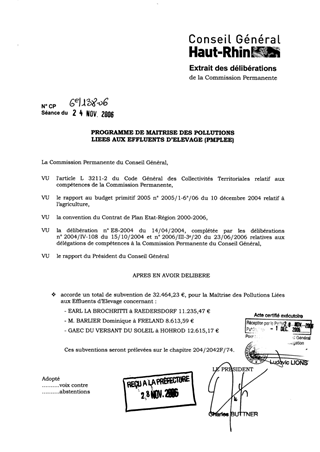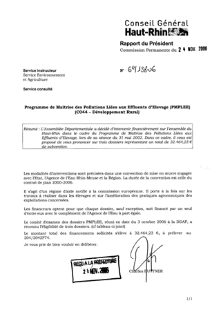 : L’Assemblée Départementale a décidé d’intervenir financièrement sur l’ensemble du Haut-Rhin dans le cadre du Programme de Maîtrise des Pollutions Liées aux Effluents d’Elevage, lors de sa séance du 31 mai 2002. Dans ce cadre, il vous est proposé de vous prononcer sur trois dossiers représentant un total de 32.464,23 € de subvention.