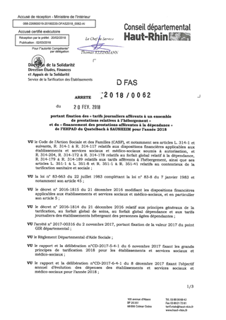 portant fixation des "tarifs journaliers afférents à un ensemble de prestations relatives à l'hébergement" et du "financement des prestations afférentes à la dépendance" de l'EHPAD du Quatelbach à SAUSHEIM pour l'année 2018 Resumé Pièces jointes ARRETE Assemblée : Non défini Date : 20/02/2018 Rapporteur : Non défini Collectivité : Conseil départemental du Haut-Rhin Direction : Non défini Service : Direction de la Solidarité Domaine : Prix de Journée Commission :