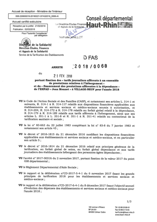portant fixation des "tarifs journaliers afférents à un ensemble de prestations relatives à l'hébergement" et du "financement des prestations afférentes à la dépendance" de l'EHPAD "Jean Monnet" à VILLAGE-NEUF pour l'année 2018 Resumé Pièces jointes ARRETE Assemblée : Non défini Date : 21/02/2018 Rapporteur : Non défini Collectivité : Conseil départemental du Haut-Rhin Direction : Non défini Service : Direction de la Solidarité Domaine : Prix de Journée Commission :