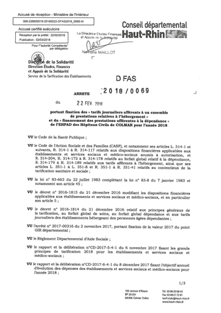portant fixation des "tarifis journaliers afférents à un ensemble de prestations relatives à l'hébergement" et du "financement des prestations afférentes à la dépendance" de l'EHPAD des hôpitaux civils de COLMAR pour l'année 2018 Resumé Pièces jointes ARRETE Assemblée : Non défini Date : 22/02/2018 Rapporteur : Non défini Collectivité : Conseil départemental du Haut-Rhin Direction : Non défini Service : Direction de la Solidarité Domaine : Prix de Journée Commission :